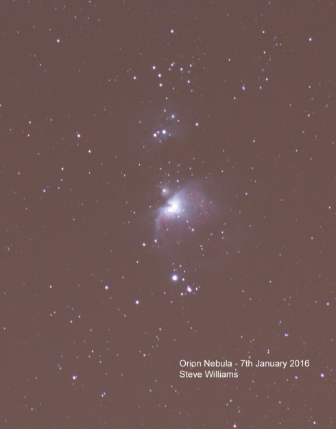 The Orion Nebula (M42) taken on 7th January 2016. The 'Running Man' nebula can just about be made out to the North of M42. More subs will hopefully enable a better result, but that will be for another evening!