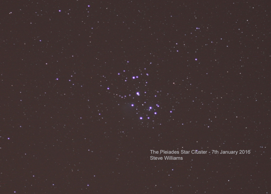 The Pleiades Star Cluster as imaged on 7th January 2016. This image consists of 10 x 20 second subs, stacked in Deep Sky Stacker and processed in Photoshop.