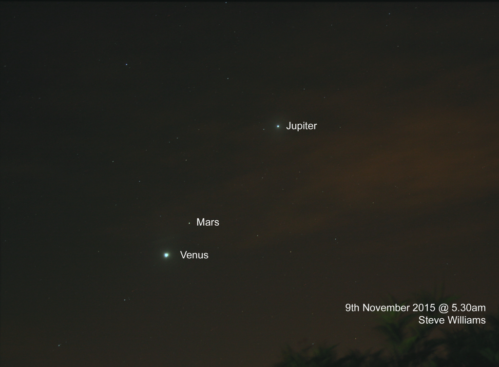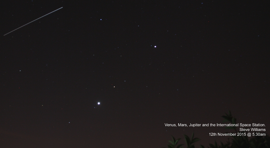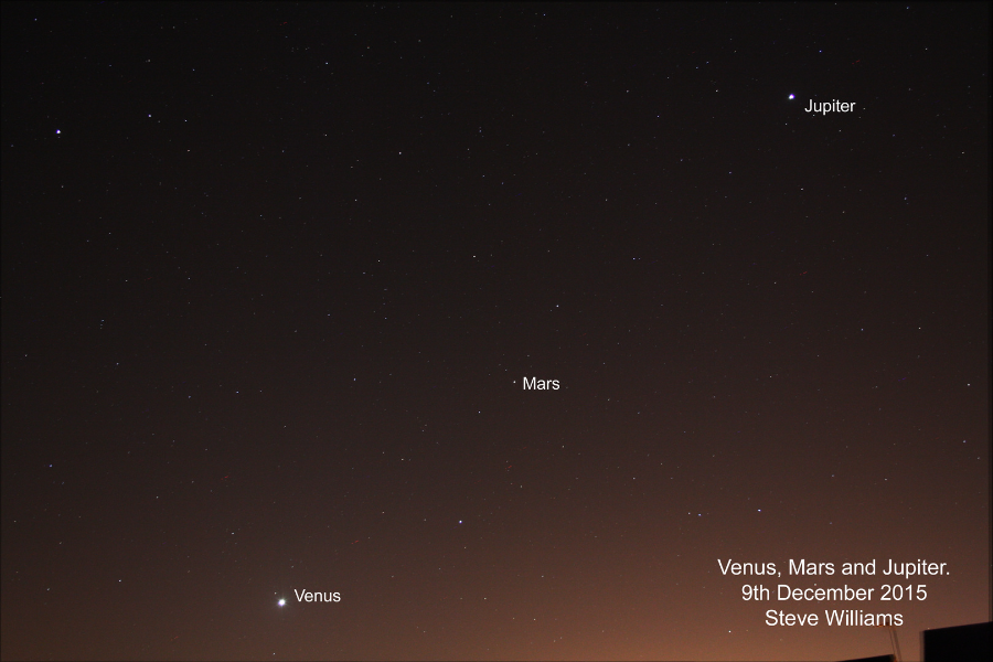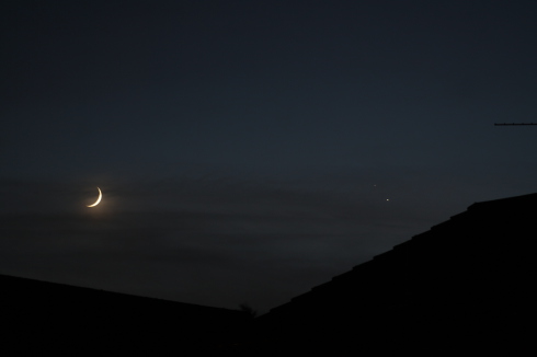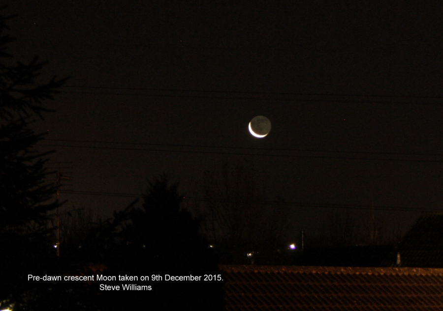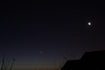 The 'old' crescent Moon, Saturn, Venus and Mercury as imaged in the early morning twilight on 10th December 2012 at 6.45UT. (Mercury is just visible beneath the power lines to the lower left of Venus!)