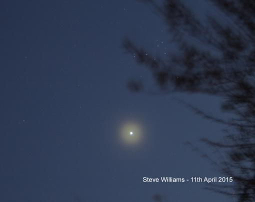 Venus at it's closest to the Pleiades Star Cluster as taken on 11th April 2015. Eight 20 second exposure images stacked at ISO 400.