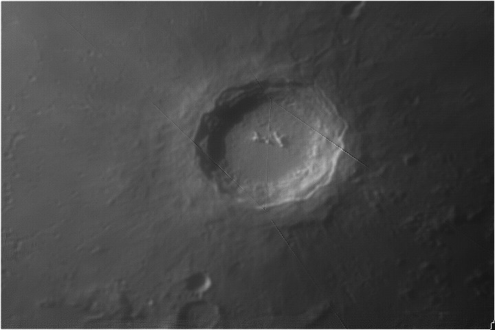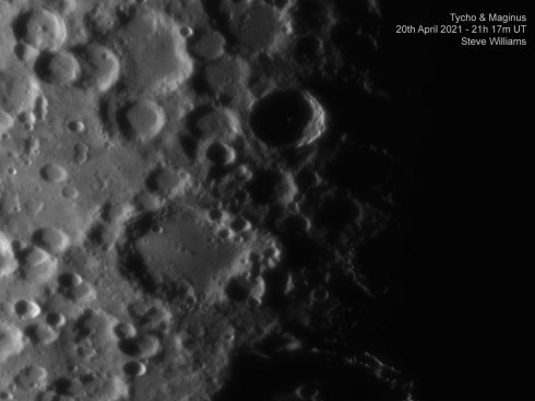 Crater Tycho as imaged on 9th February 2014. As with the preceding image of Copernicus, some high level cloud was passing across the Moon at the time of capture. Tycho is of course famous for it's very bright rays that stretch across the Moon around the time of Full Moon. The crater itself is relatively young (108 million years) and is a shade over 86km in diameter.