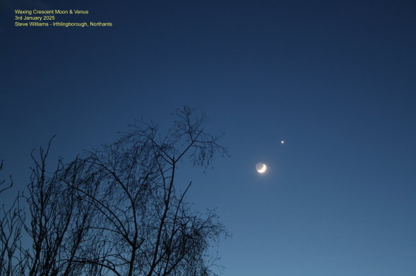 The waxing crescent Moon and Venus as they appeared in the south-western early evening sky on 3rd January 2025