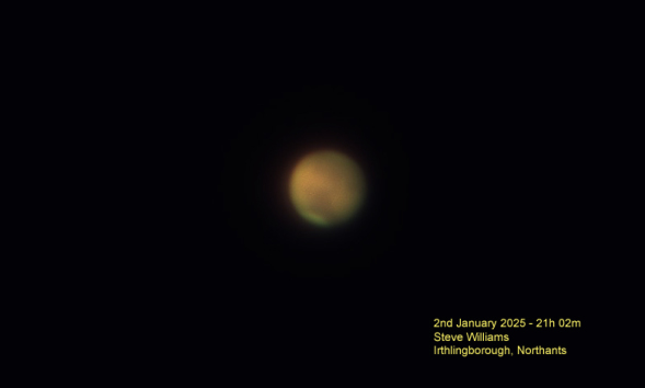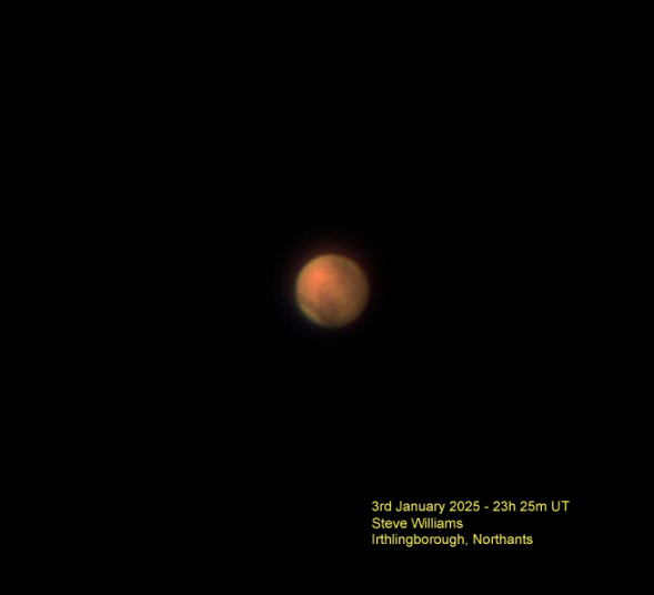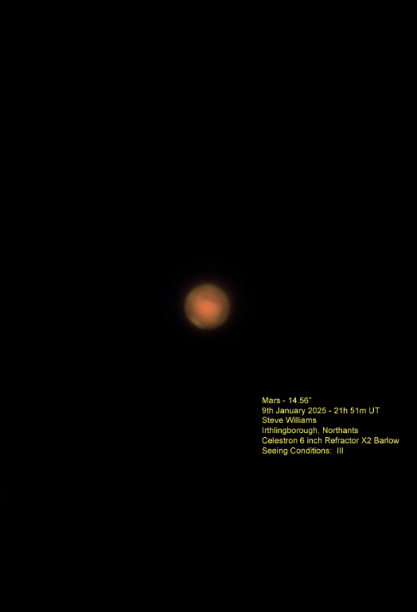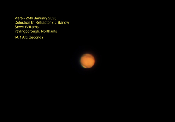 Mars as imaged on 25th January 2025 using a Celestron 6-inch Refractor and X2 Barlow. Despite being only nine days past opposition, the Martian disc size has already started to decline!!