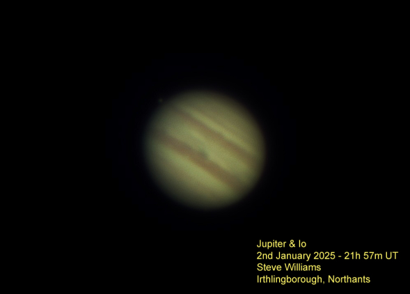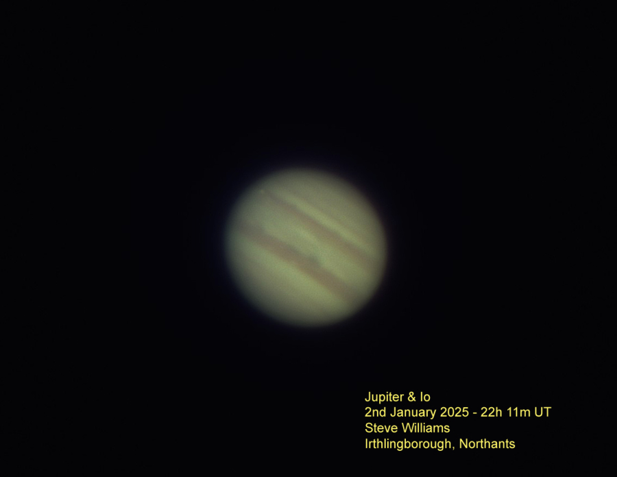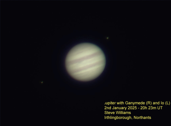 Jupiter as imaged on 2nd January with 2025 with two of it's Galilean moons's (Ganymede to the right and Io to the left)