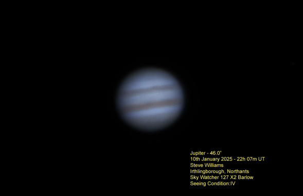 Jupiter as imaged on 10th January 2025 using a Sky Watcher 127 and X2 Barlow.