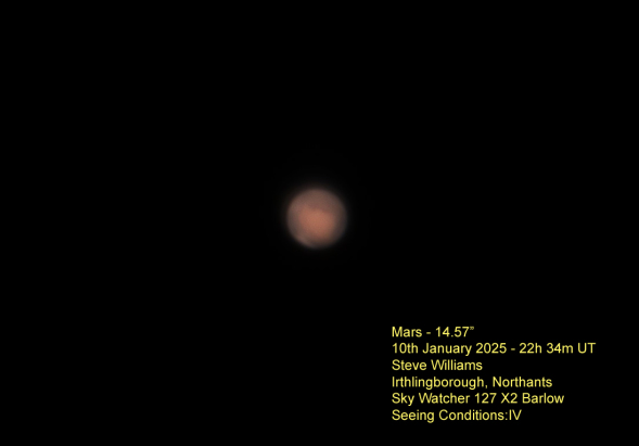 Mars as imaged on 10th January 2025 using a Sky Watcher 127 and X2 Barlow.