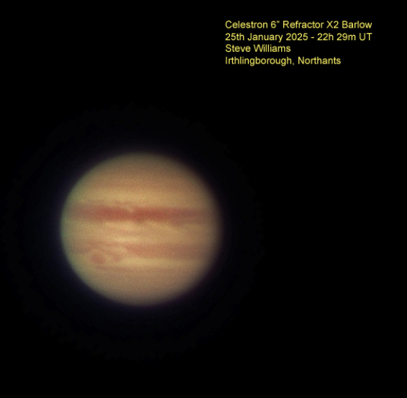Jupiter as imaged on 25th January 2025 using a Celestron 6-inch Refractor and X2 Barlow. The Great Red Spot can be seen to the lower left along with some cloud structure in the equatorial region.