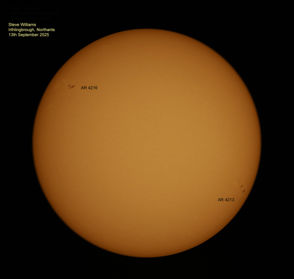 As it's been a couple of months since I last imaged the Sun, I took this image in 'white light' on 13th September. Only a couple of sunspots were visible, giving a relatively quite appearance to the solar disc.
