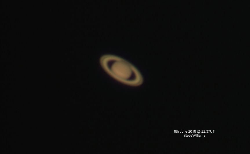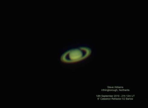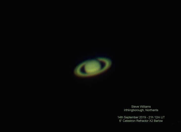 Saturn - 7th September 2021 @ 20h 53m UT. Celestron 6" Refractor, X2 Barlow, ASI 120 MC Camera and IR Filter.